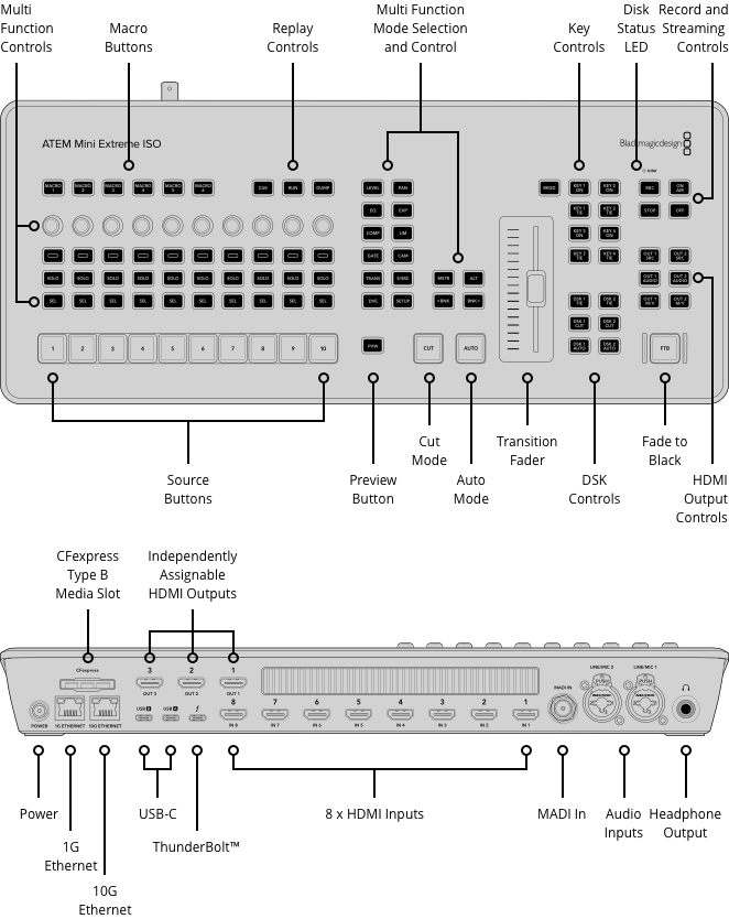 ATEM Mini Extreme ISO G2 is a powerful yet compact live switcher for building a high-end broadcast studio. Get an expanded professional style control panel with built in streaming, 8 standards converted HDMI inputs, 3 independent HDMI outputs, built in streaming engine, multi-view, CFexpress and Thunderbolt for record/playback. There is also 10G Ethernet for fast network storage access, XLR audio inputs, USB webcam, DVE, chroma key, media player and ISO recording of all 8 video inputs.